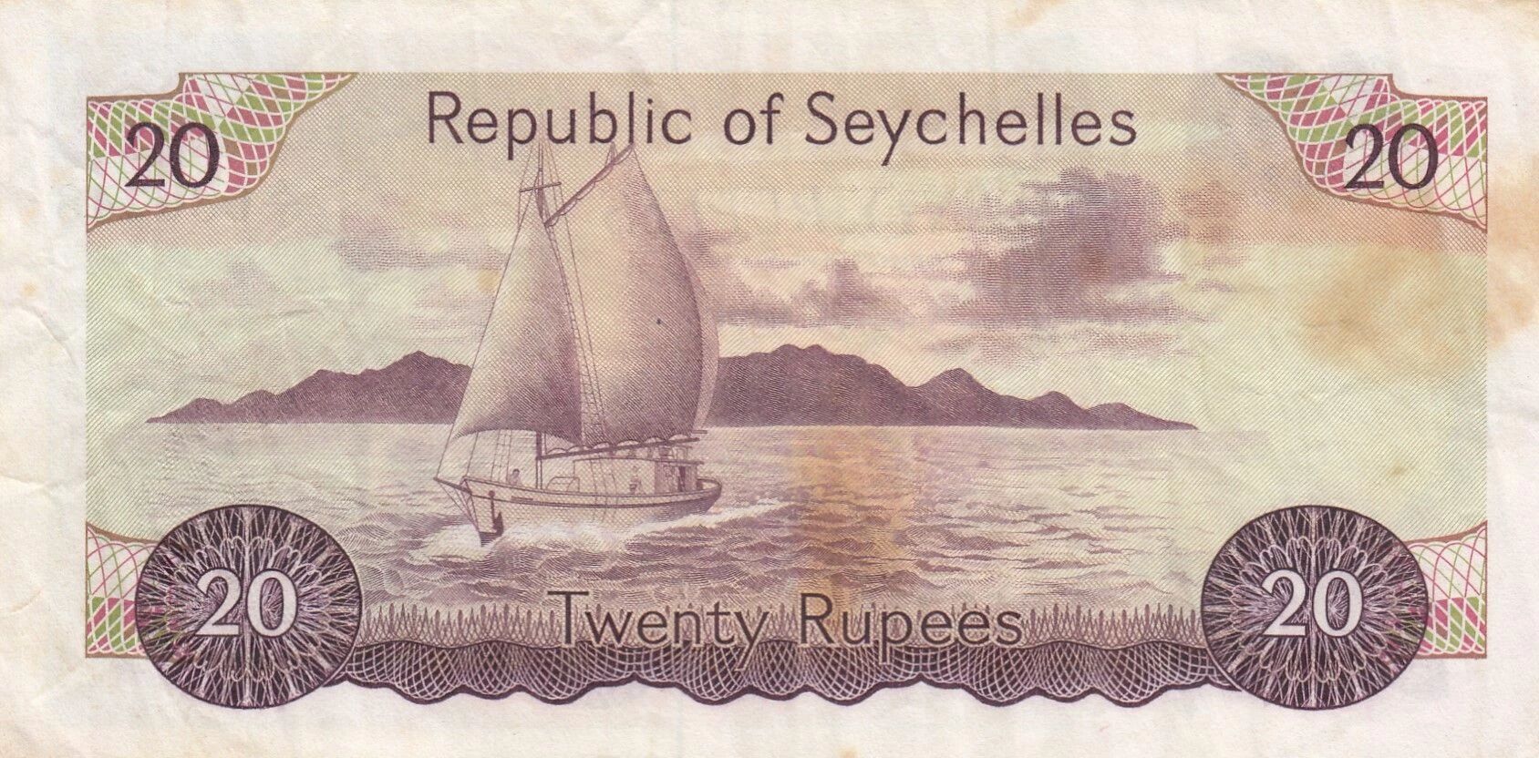 The back of the banknote features a scene depicting local activities in the Seychelles. It shows fishermen at sea with traditional boats. The face value, "20 Rupees", is written in the upper left and lower right corners. The name of the country, "Seychelles", is repeated at the top of the banknote. The inscription "Central Bank of Seychelles" is also printed on the back.