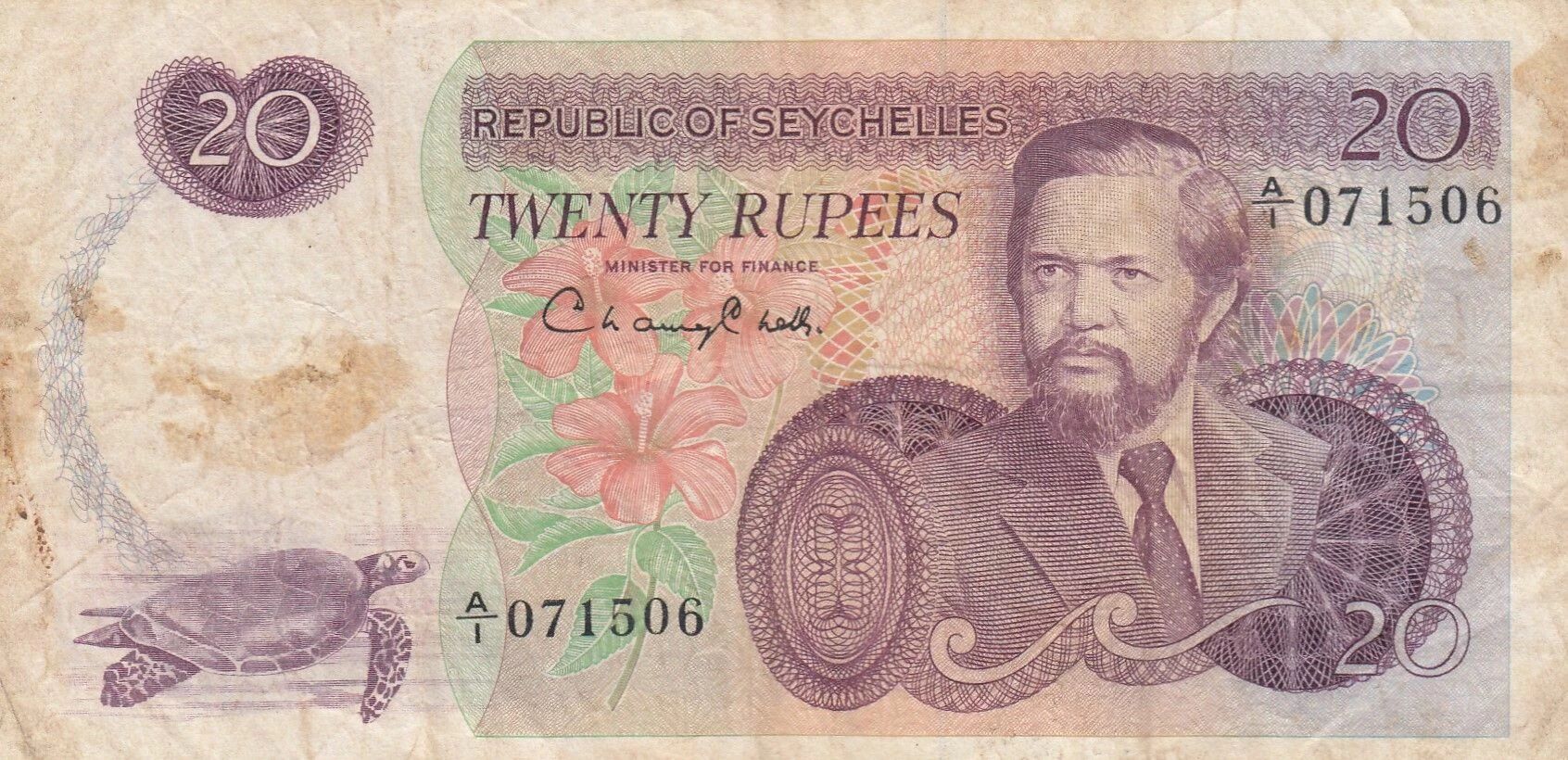 This 1977 20 rupee banknote is a testament to the monetary history of the Seychelles and a reflection of its national identity through the representation of its president and cultural symbols.
