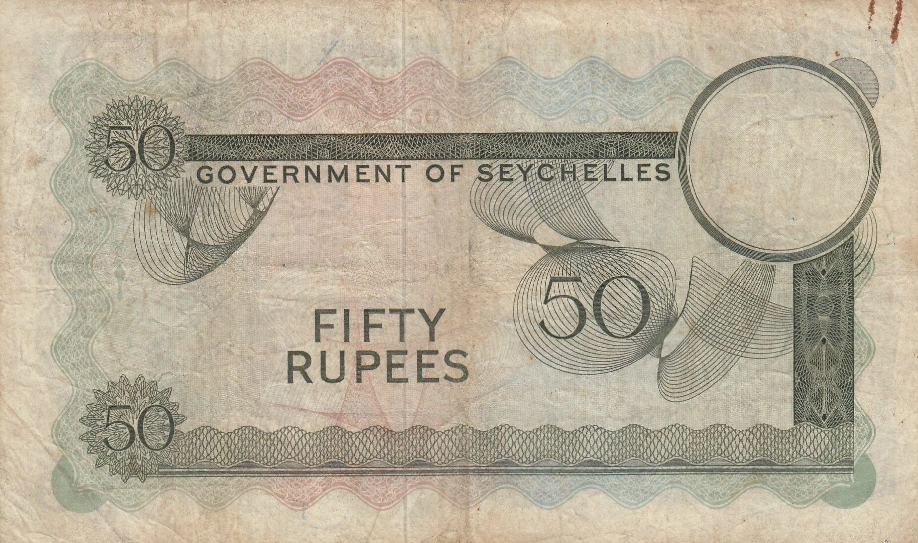 Ce billet de banque de 50 Rupees, émis par les Seychelles en 1972, constitue un témoignage de l'histoire monétaire de l'archipel. Il appartient à la série A/I. Ses dimensions sont de 156 millimètres de longueur sur 92 millimètres de largeur.