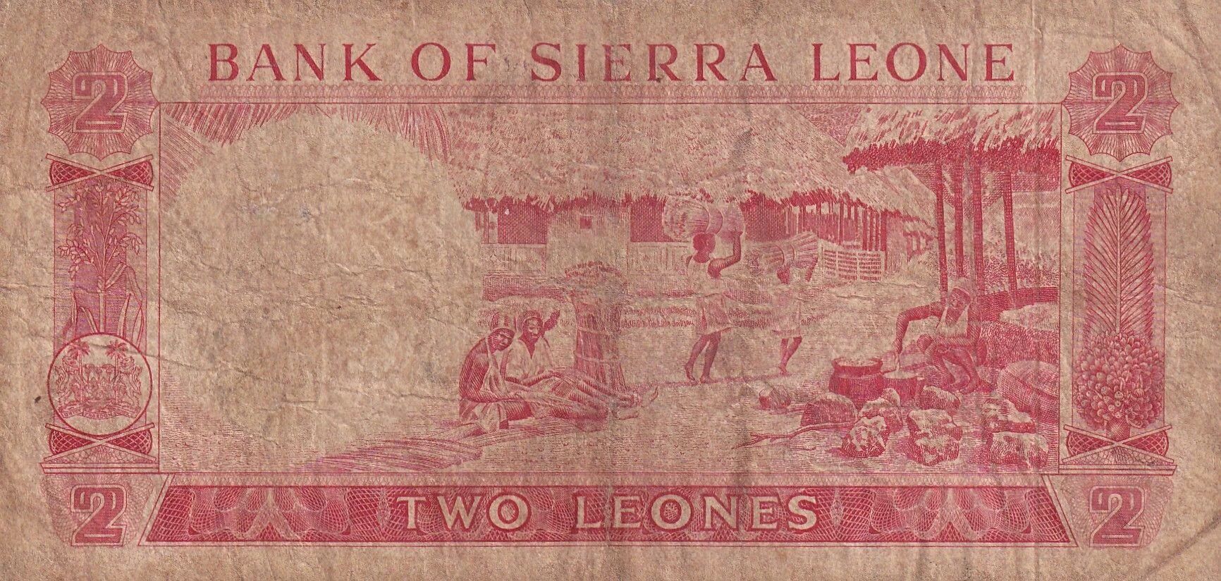 Au verso, une scène de village est représentée, illustrant des aspects de la vie locale en Sierra Leone. La valeur faciale "2" est également présente au verso, ainsi que la mention de l'unité monétaire "LEONES". Des motifs décoratifs encadrent la scène.