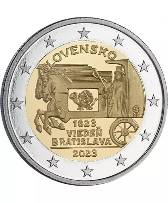 A two-horse stagecoach is shown speeding along, with the symbol of the horse-drawn express post in the centre. At the top of the image is the State of issue "SLOVENSKO" and, below the design, the year "1823" and the occasion of issue "VIEDE? - BRATISLAVA".