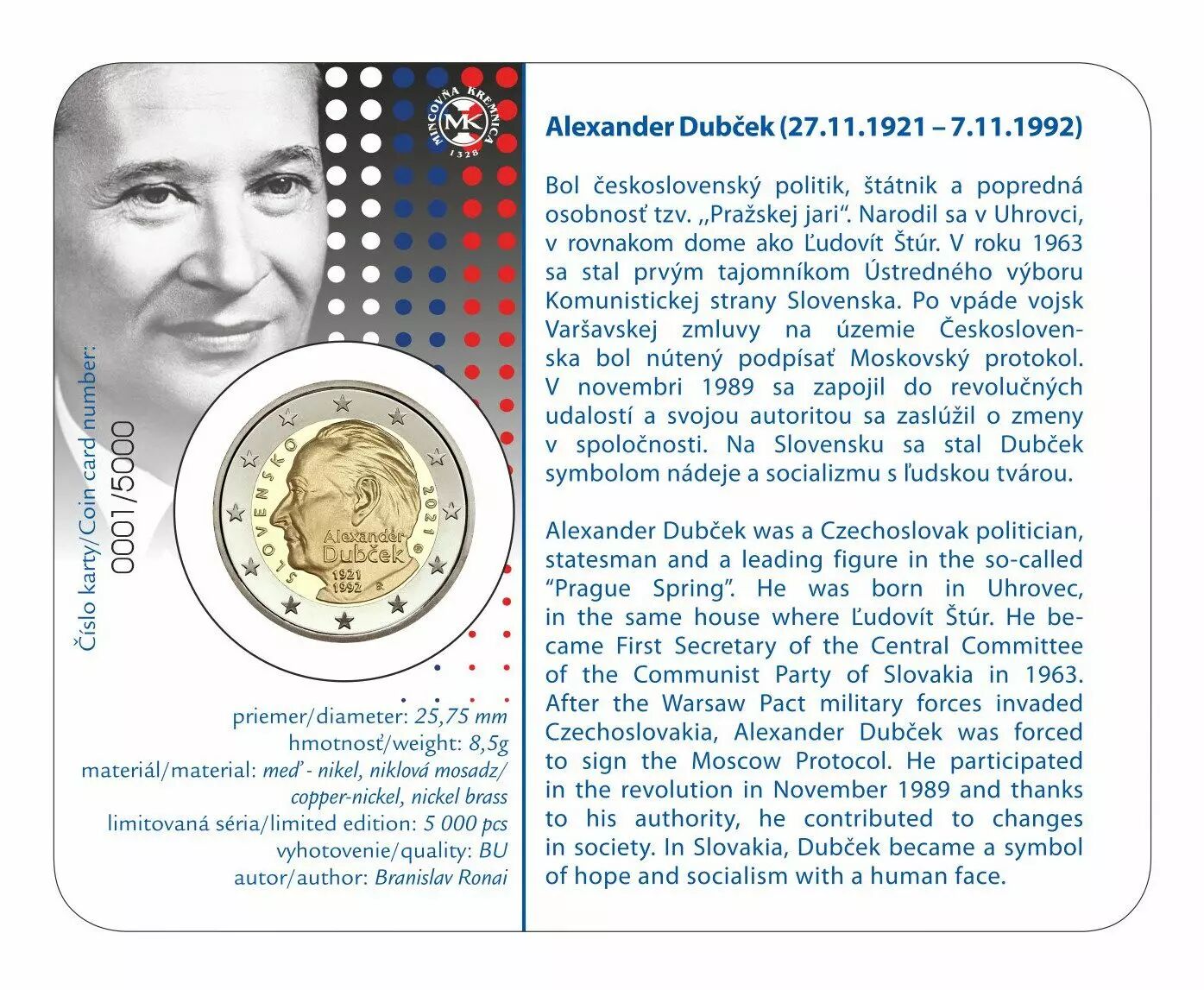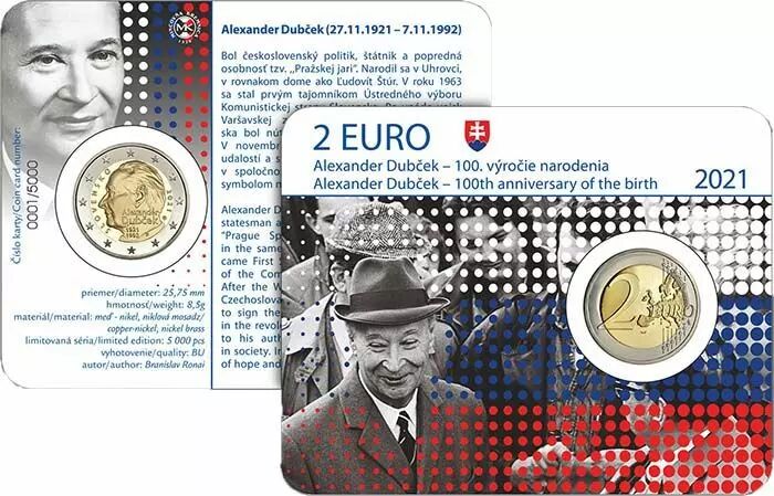Accueil > Archivage > archivage-Archivage > Slovaquie 2 Euros Commémo. BU Coincard SLOVAQUIE 2021 - 100 ans d'Alexander Dub?ek