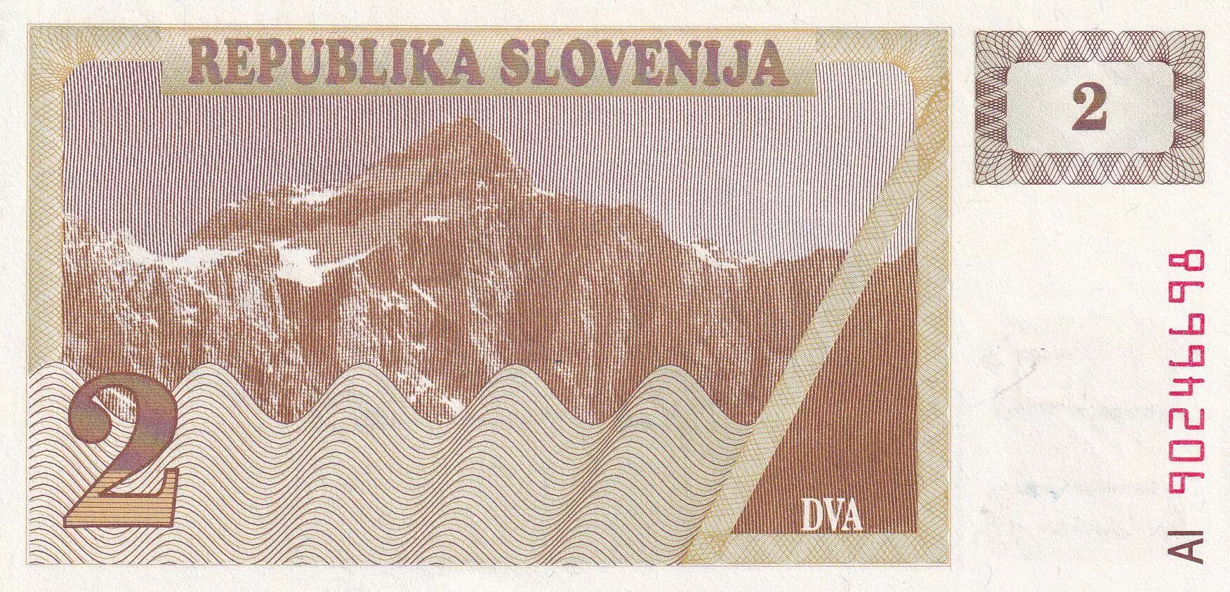 Home > World Banknotes > European Banknotes > Slovenia > Slovenia 2 Tolarjev - Mountain - 1990 - Serial AJ