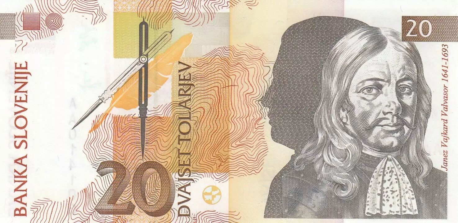 Banknote Slovenia 20 Tolarjev, Janez Vajkard Valvasor - Angels - 1992 - Serial AA