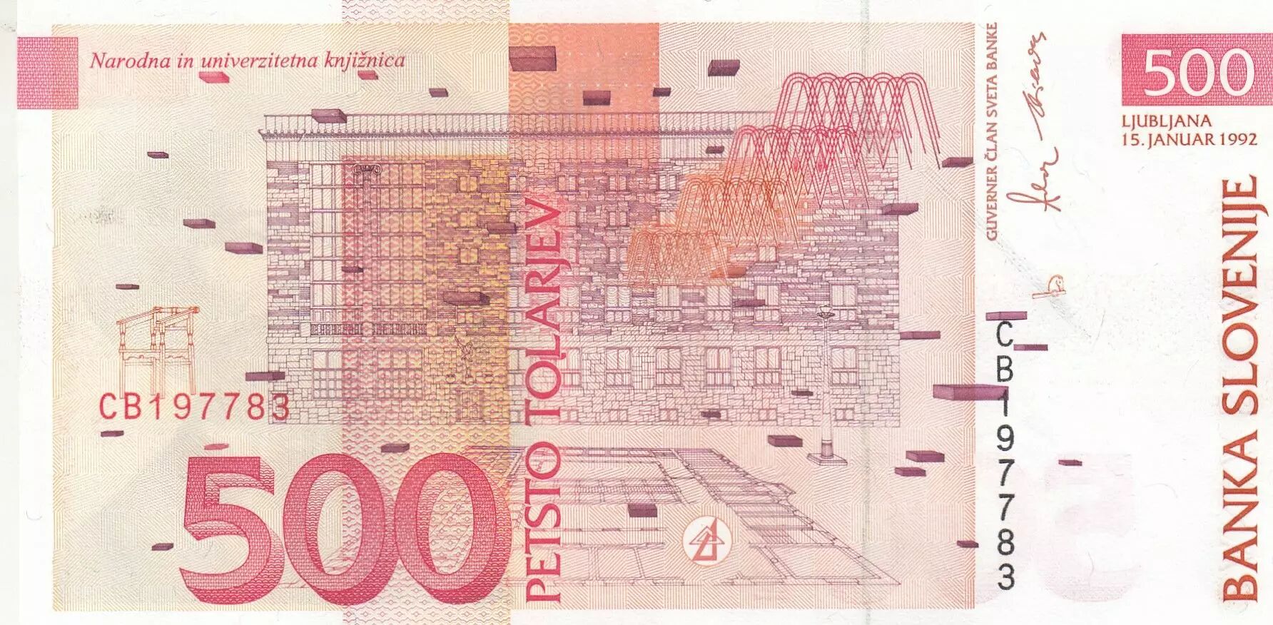 The back of the banknote features a drawing of the eastern facade of the National and University Library of Ljubljana, a building designed by Ple?nik. A plan of the library is reproduced in the lower part of the banknote.