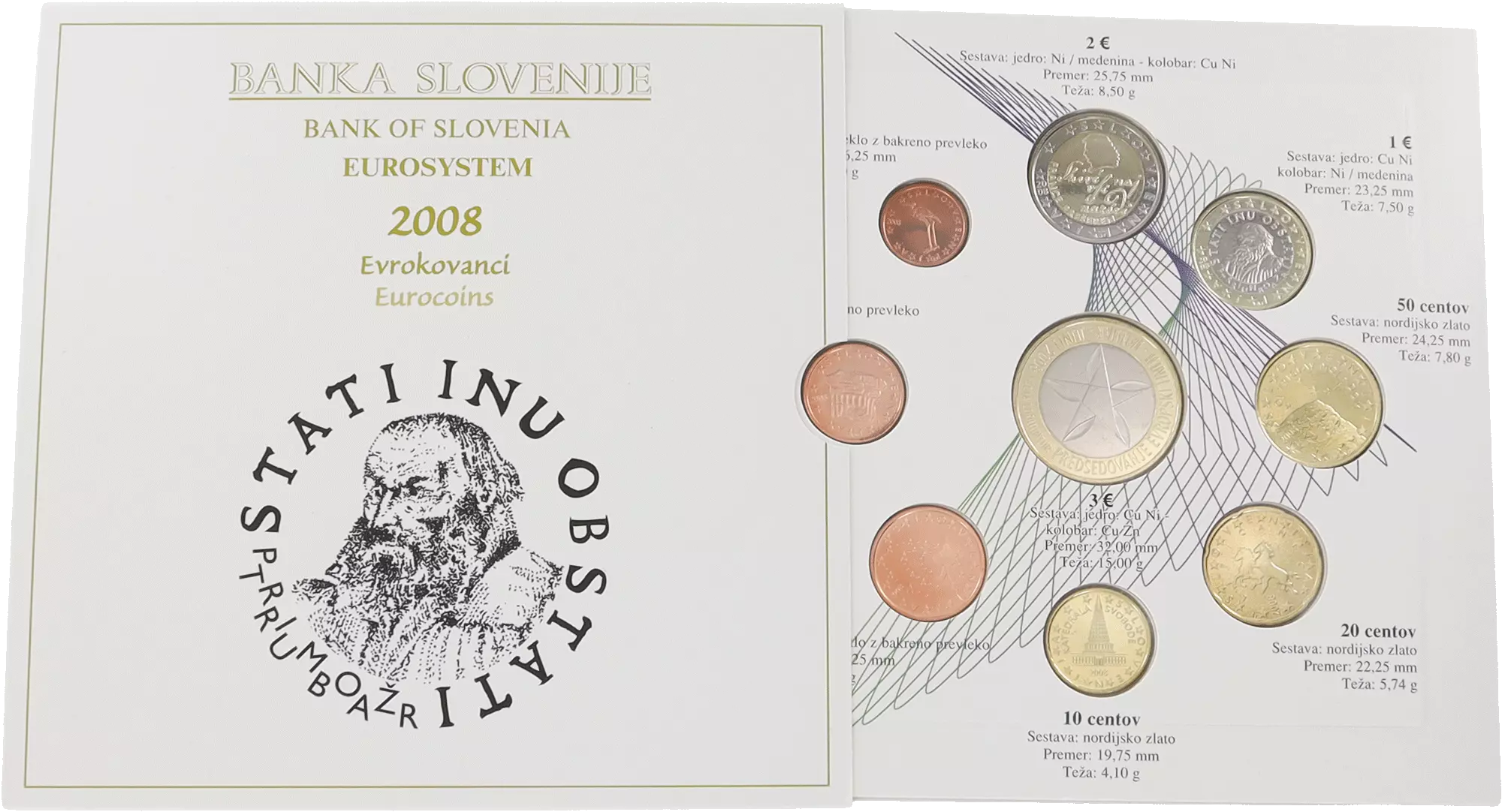 Contains 8 coins from the 1 cent to the 2 euros in the year 2008 + 3 euros commemorative 2008 Presidency of the E.U.".