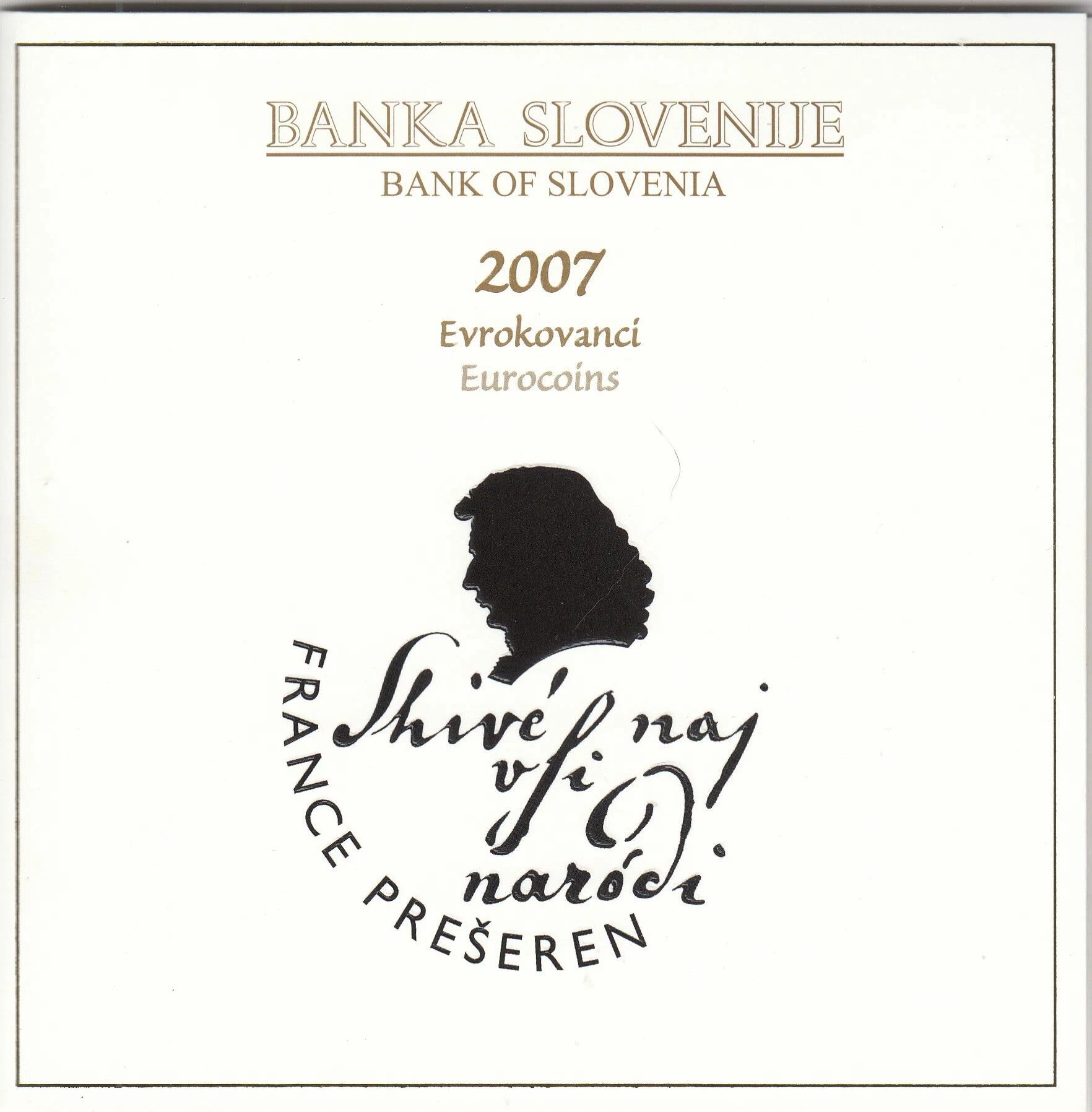 The 2 euro coin features the portrait of the poet France Pre?eren and a verse from his poem "Zdravljica", which is also the Slovenian national anthem. All coins feature the twelve stars of the European flag.
