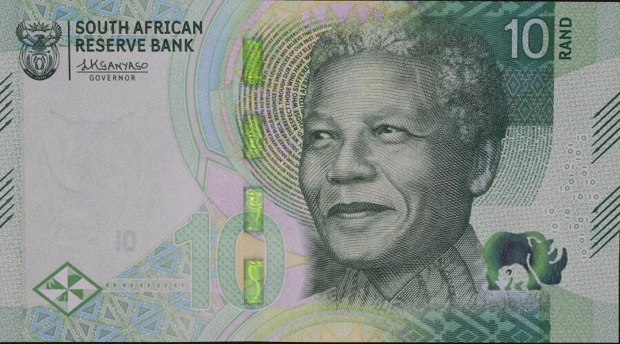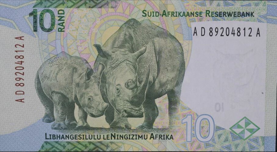 The 10 Rand banknote, issued by South Africa in 2023, is part of the AD-A series. This commemorative banknote highlights Nelson Mandela and African wildlife, particularly the black rhinoceros.