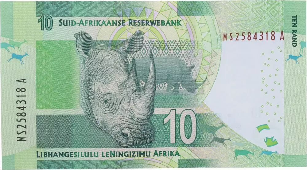 The reverse of the banknote, also green with multicoloured prints, features a rhinoceros head in the center. The inscriptions "Suid-Afrikaanse Reserwebank" and "Libhangesilulu leNingizimu Afrika" appear, both meaning "South African Reserve Bank" in different local languages, as well as the denomination "TEN RAND".