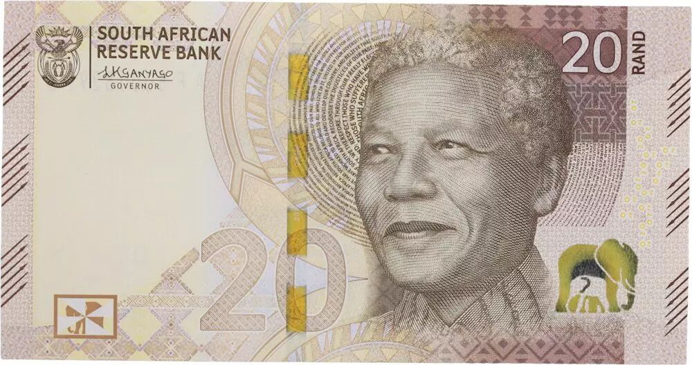 The 20 South African Rand banknote issued in 2023 features Nelson Rolihlahla Mandela on its obverse. The South African Reserve Bank is the issuing institution of this banknote. The face value of this banknote is twenty Rand.