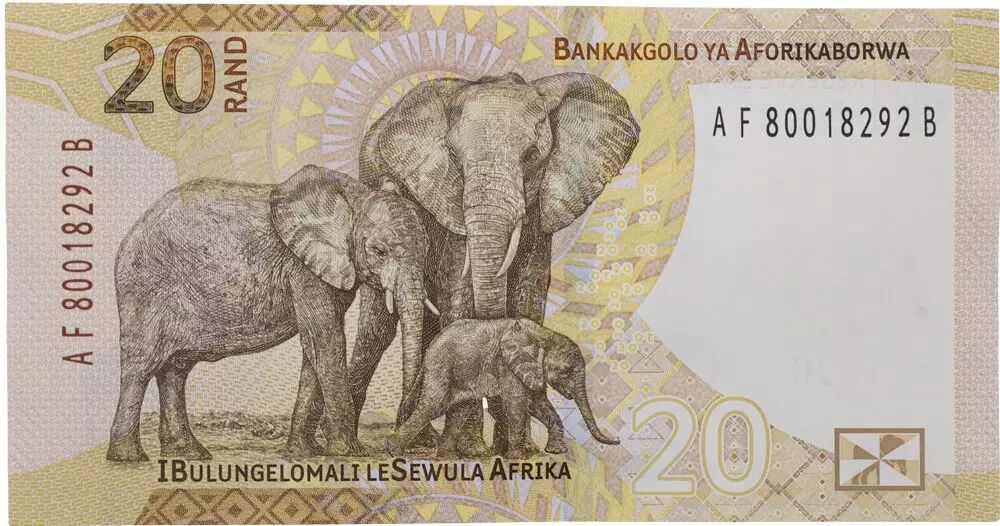 The reverse of the banknote illustrates elephants. The inscriptions "20 BANKAKGOLO YA AFORIKABORWA" and "TWENTY RAND" are present, accompanied by "IBULUNGELO-MALI ELIKHULU LESEWULA AFRIKA". These inscriptions reiterate the value of the banknote in different national languages, still in the Latin alphabet.