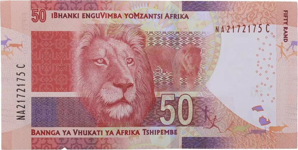 The back of the banknote features a lion's head, placed in the center. Additional inscriptions in local languages, "iBhanki enguVimba yoMzantsi Afrika" and "Bannga ya Vhukati ya Afrika Tshipembe", also appear, followed by the face value "FIFTY RAND - 50 -". The writing is also in the Latin alphabet.