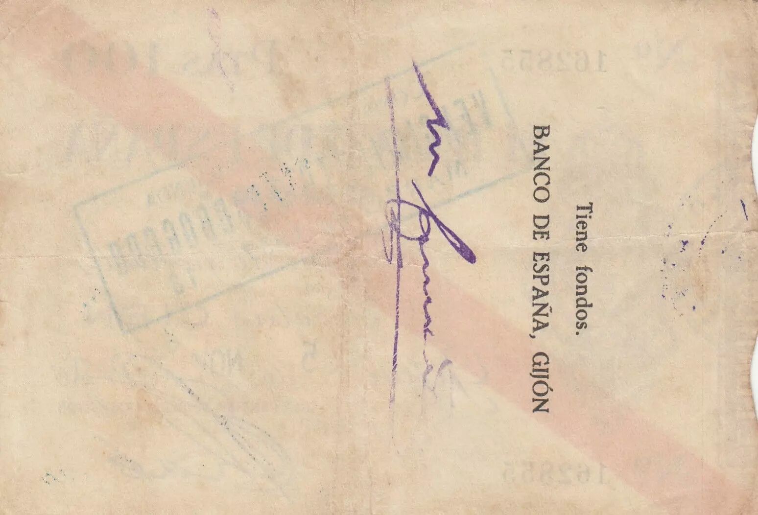 This Spanish banknote with a face value of 100 pesetas was issued in 1936. It belongs to an unspecified series and was printed by the Caja Central de Depositos in Gijón.