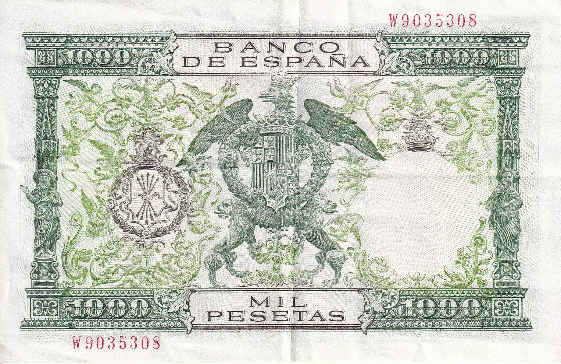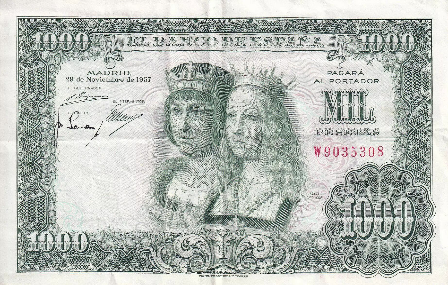 Home > > Spain 1000 Pesetas - Catholics kings - Coat of arms - 1957 - Serial W - P.78