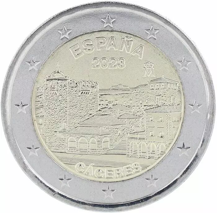 The 2 euro commemorative coin of Spain 2023 is dedicated to the old town of Caceres. It is the fourteenth coin in the annual series dedicated to Spanish sites inscribed on UNESCO's World Heritage List.