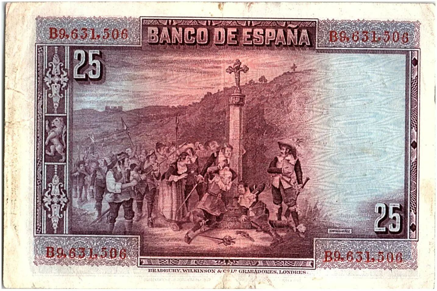 Home > > Spain 25 Pesetas P. Calderon de la Barca - 1928 - Serial B - VF - P.74