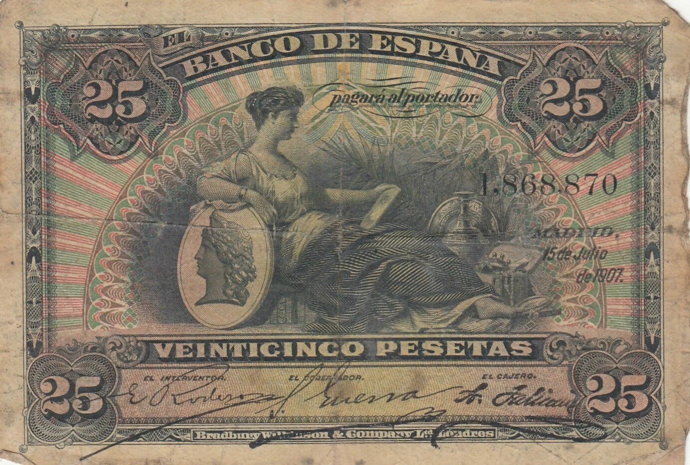 The 25 Pesetas banknote issued in Spain in 1907 represents a form of fiat currency from that era. This banknote has a face value of 25 pesetas, the monetary unit used in Spain at that time.