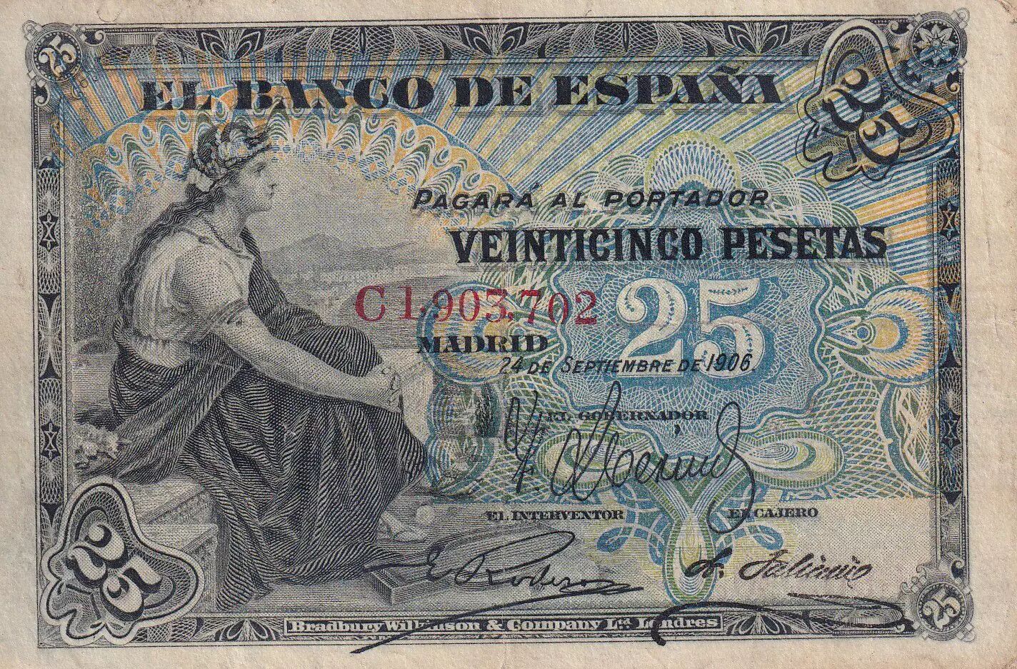 Home > World Banknotes > European Banknotes > Spain > Spain 25 Pesetas - Woman seated - Arms - 1906 - P.57a