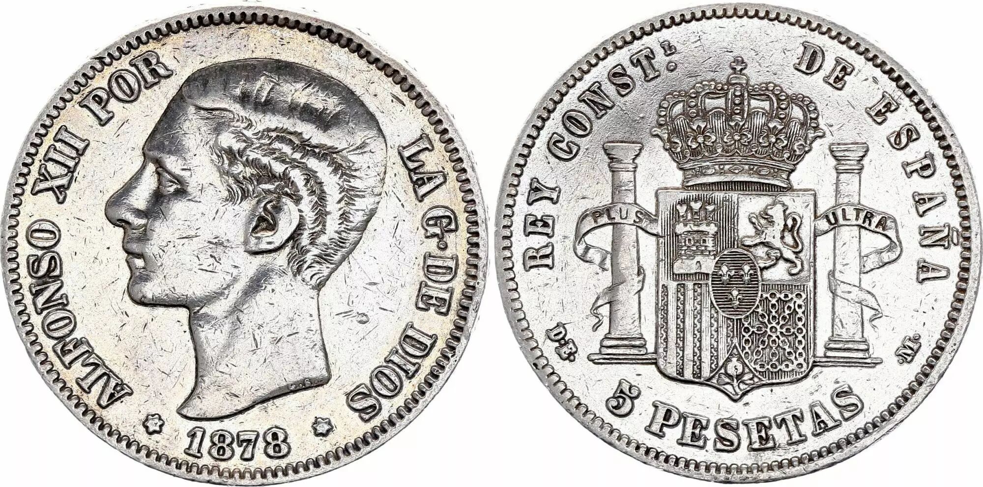 Home > > Spain 5 Pesetas, Alfonso XII - Arms --1878 - Silver - VF - KM.671