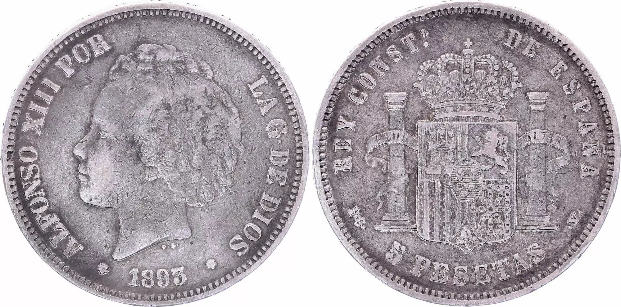 Coin Spain 5 Pesetas, Alfonso XIII - Arms -1893 (93 ) PG V