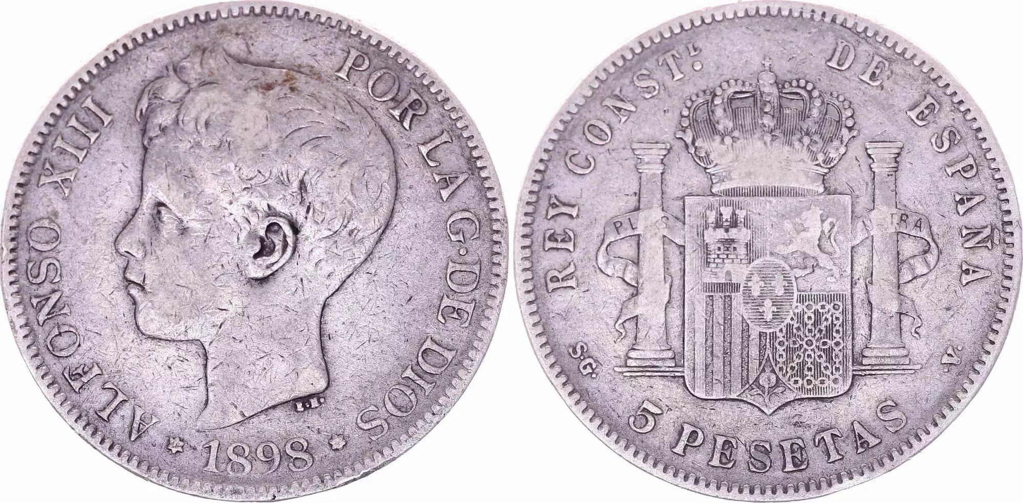 Coin Spain 5 Pesetas, Alfonso XIII - Arms -1898