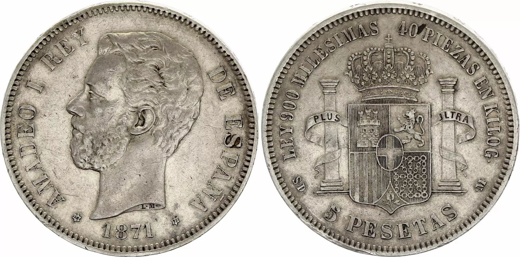 Coin Spain 5 Pesetas, Amadeo I - Arms - 1871 (71) SD-M
