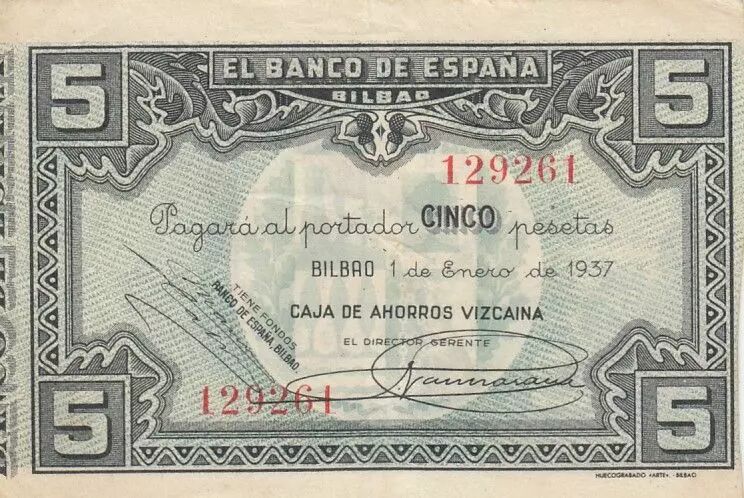 Home > > Spain 5 Pesetas - Bilbao - Caja de Ahorros Vizcaina -1937 - P.S561