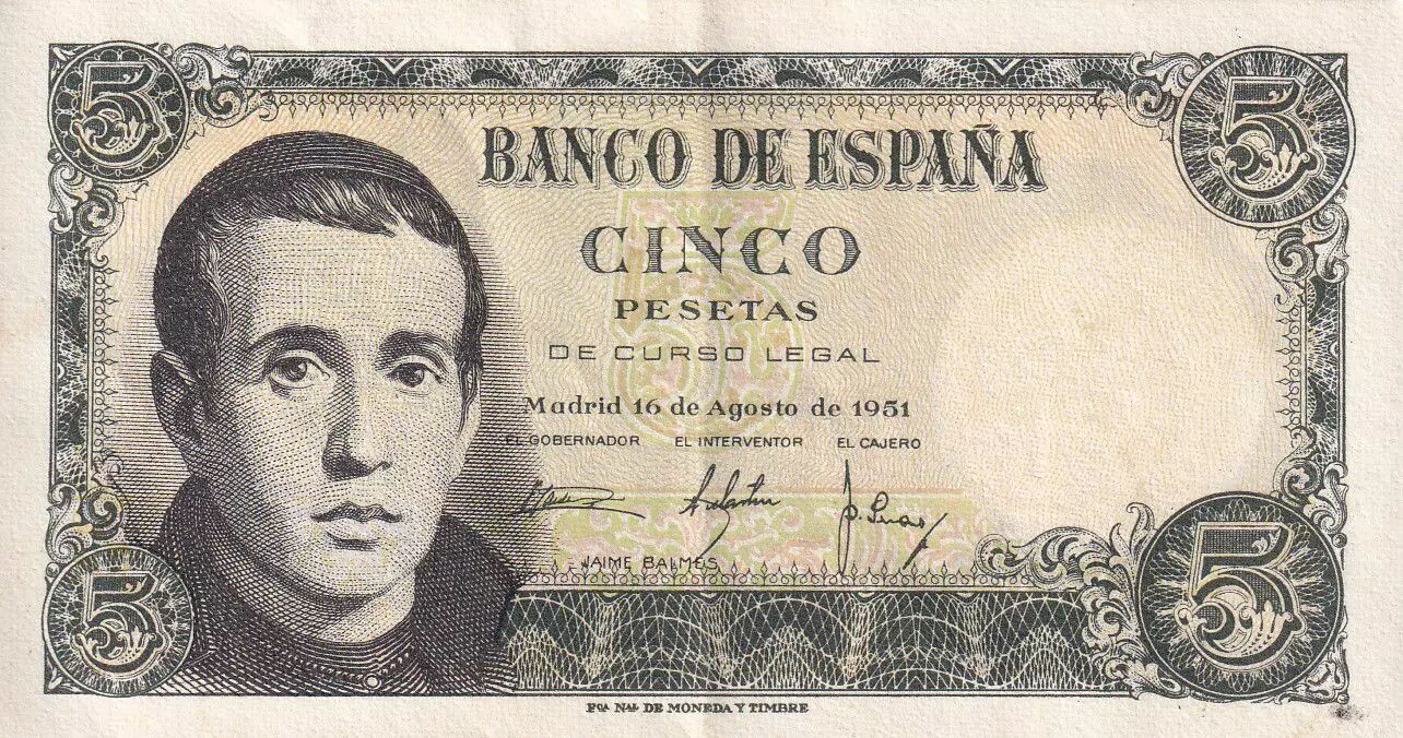 Banknote Spain 5 Pestas - Jaime Balmes - 1951 - Serial V - P.140