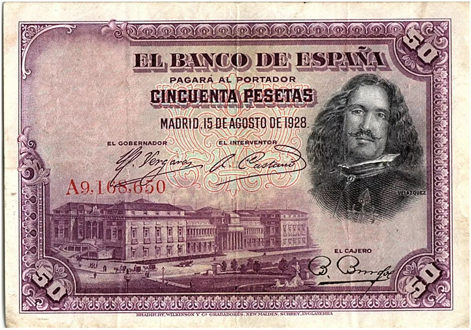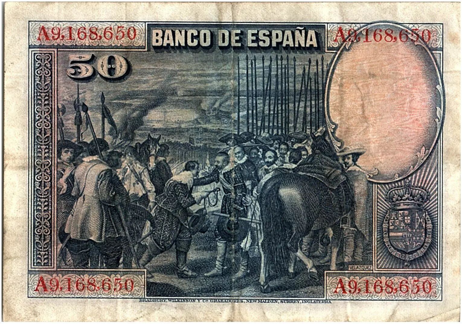 Home > > Spain 50 Pesetas - D. Vélasquez - 1928 - Serial A - VF - P.75