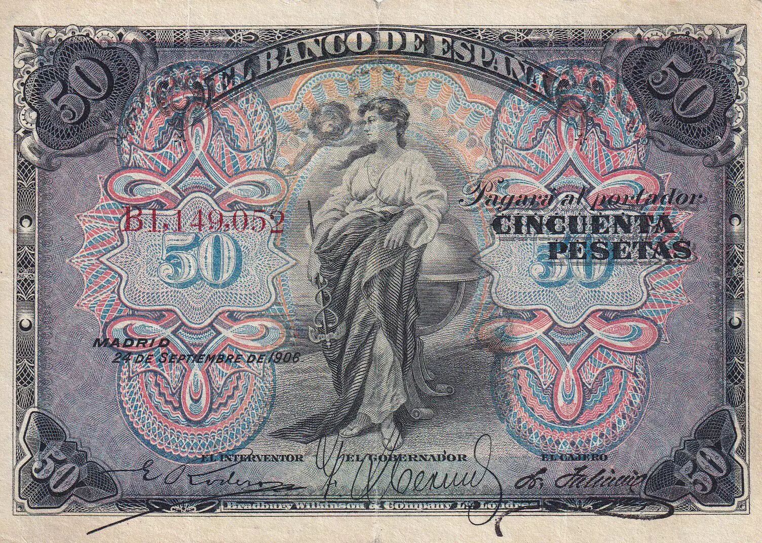 Home > World Banknotes > European Banknotes > Spain > Spain 50 Pesetas - Woman seated - Arms - 1906 - P.58a