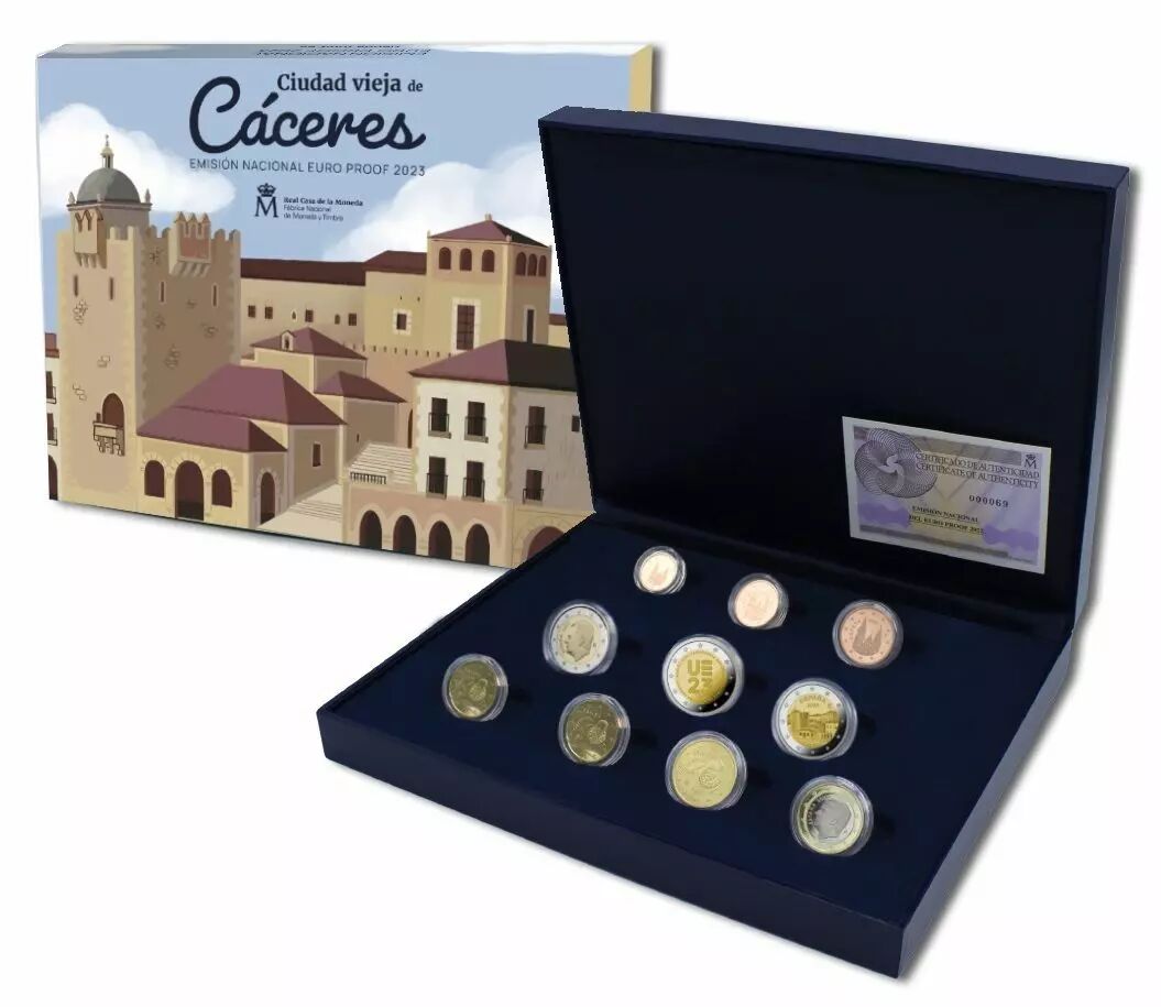 Contains 10 coins: 1 cent to the 2 euro in the year 2023 + 2 x 2 euro commemorative coins 2023 (Old Town of Caceres and Presidency of the EU).