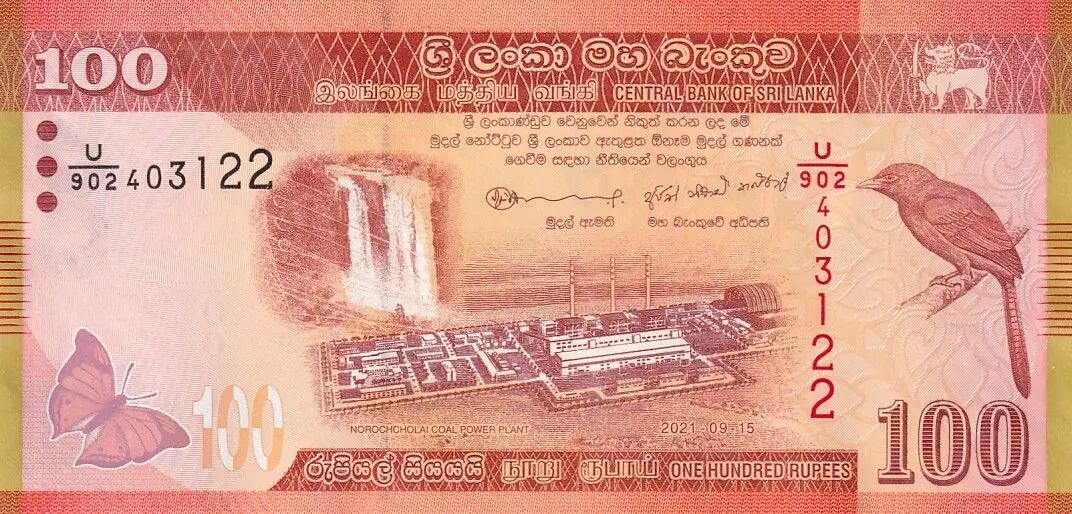 Le recto du billet présente une représentation de la centrale au charbon de Norochcholai.