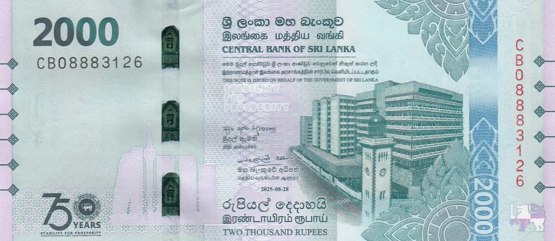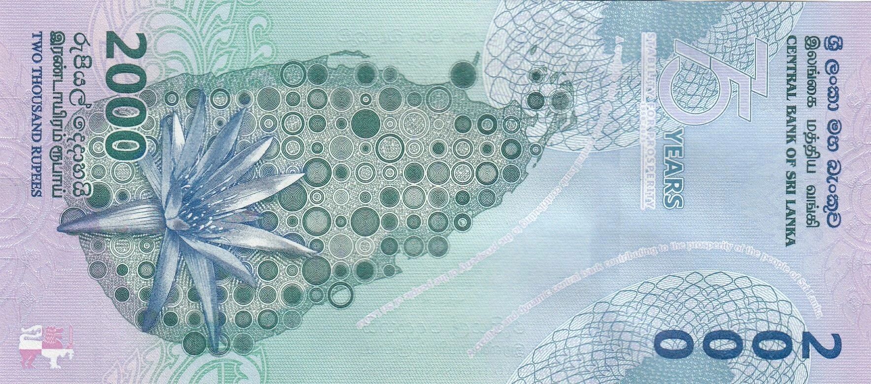 Ce billet de banque commémoratif est émis par le Sri Lanka, avec une valeur faciale de 2000 roupies. Il célèbre le 75e anniversaire de la Banque centrale du Sri Lanka, avec une date d'émission prévue pour 2025.