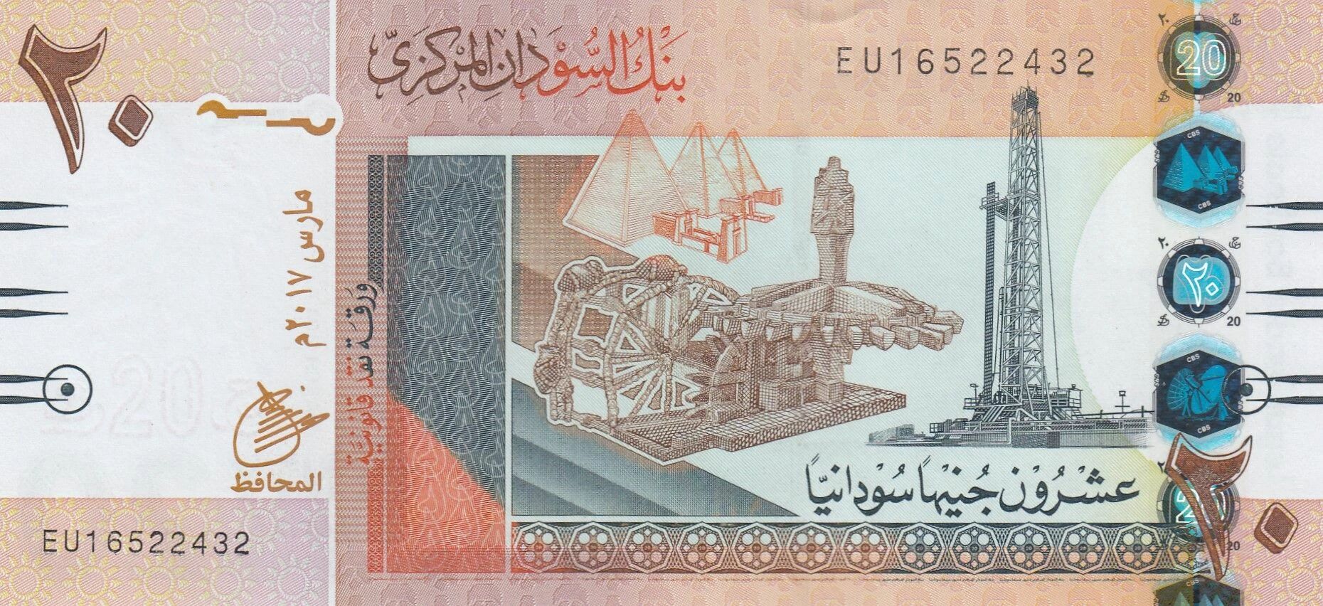 The banknote features a theme related to the oil industry, with illustrations of machinery and an oil refinery. This iconography reflects the importance of oil extraction and refining to the Sudanese economy.