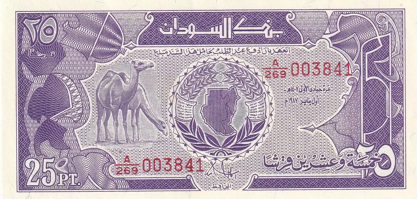 Banknote Sudan 25 Piastres - Camels - 1987 - Serial A.269 - P.37