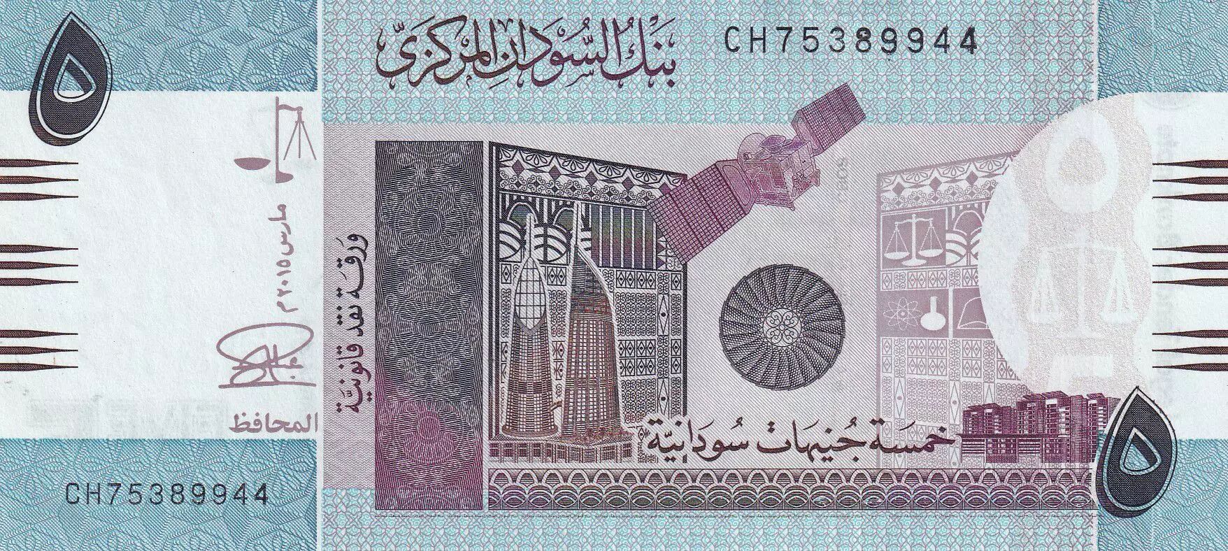 Home > World Banknotes > African Banknotes > Sudan > Sudan 5 Pounds - Satellite - 2015 - Serial CH - P.72c