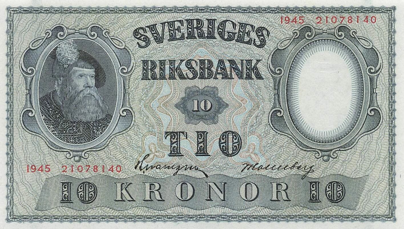 Accueil > Billets du Monde > Billets d'Europe > Suède > Suède 10 Kronor - Gustav Vasa - 1945 - P.40