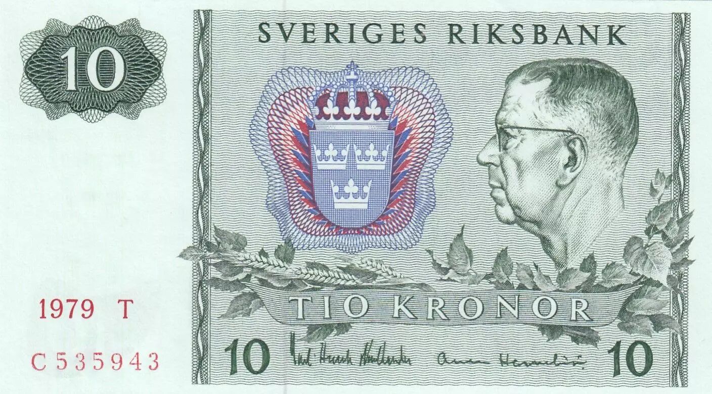 Ce billet de banque de 10 kronor suédois, émis en 1979, fait partie d'une série spécifique identifiée par le code "C 535". Il mesure 120 millimètres de long et 68 millimètres de large.