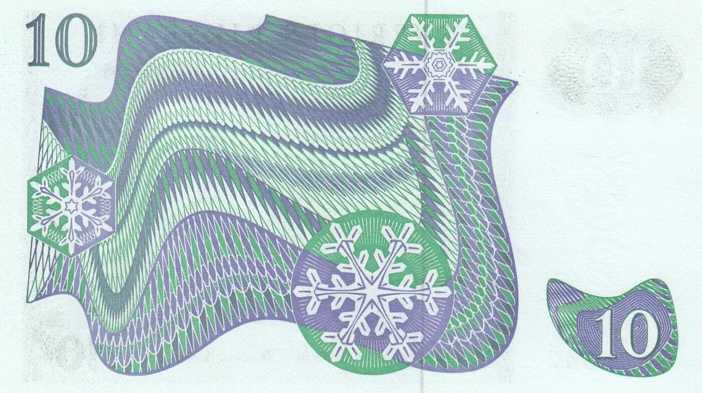 Le verso du billet est illustré avec un motif d'aurores boréales et des flocons de neige stylisés. La valeur nominale, "10", est également inscrite au verso.