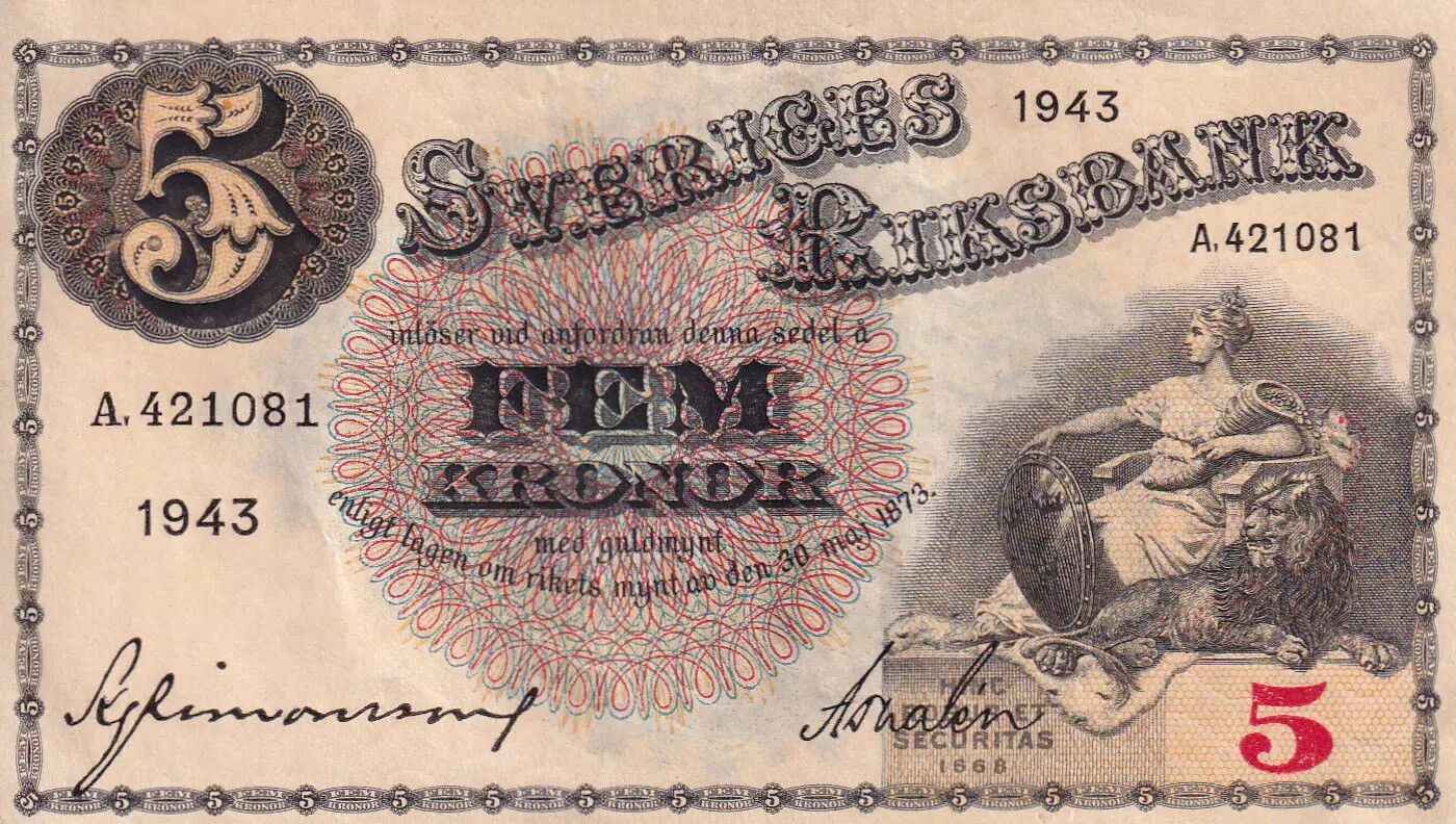 Billet Suède 5 Kronor - Svea - Gustav Vasa - 1943 - Série A - P.33z