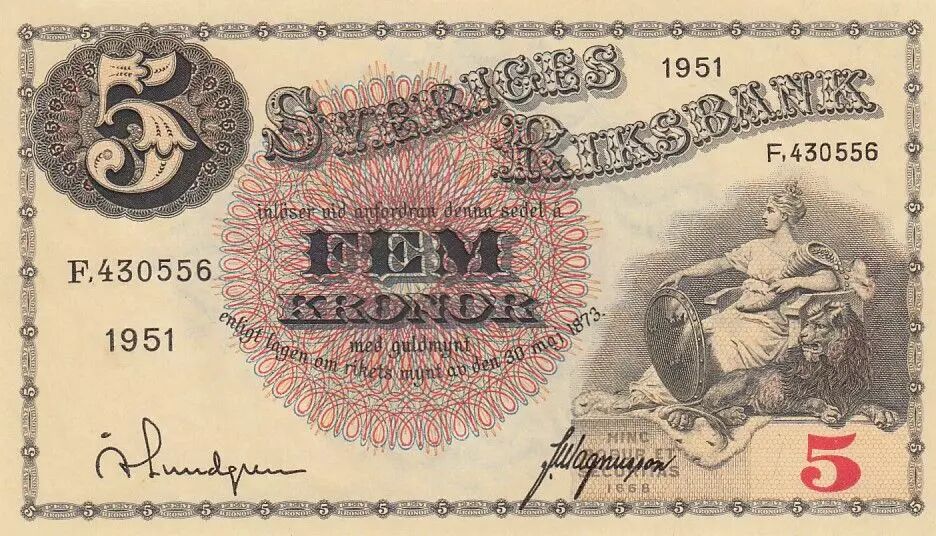 Billet Suède 5 Kronor Svea - Gustav Vasa - 1951 - Série F