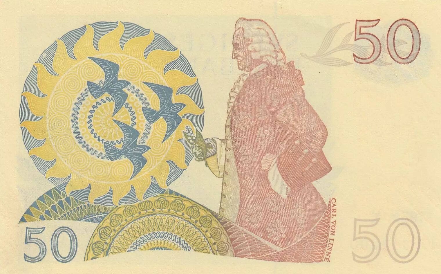 Le revers du billet met en scène Carolus Linnæus, également connu sous le nom de Carl von Linné (1707-1778), un scientifique suédois renommé pour ses contributions majeures à la botanique, à la médecine et à la zoologie. Linné est représenté tenant une fleur jumelle, identifiée comme Campanula serpyllifolia. Des éléments graphiques stylisés, tels qu'un soleil et des oiseaux, accompagnent le portrait de Linné.