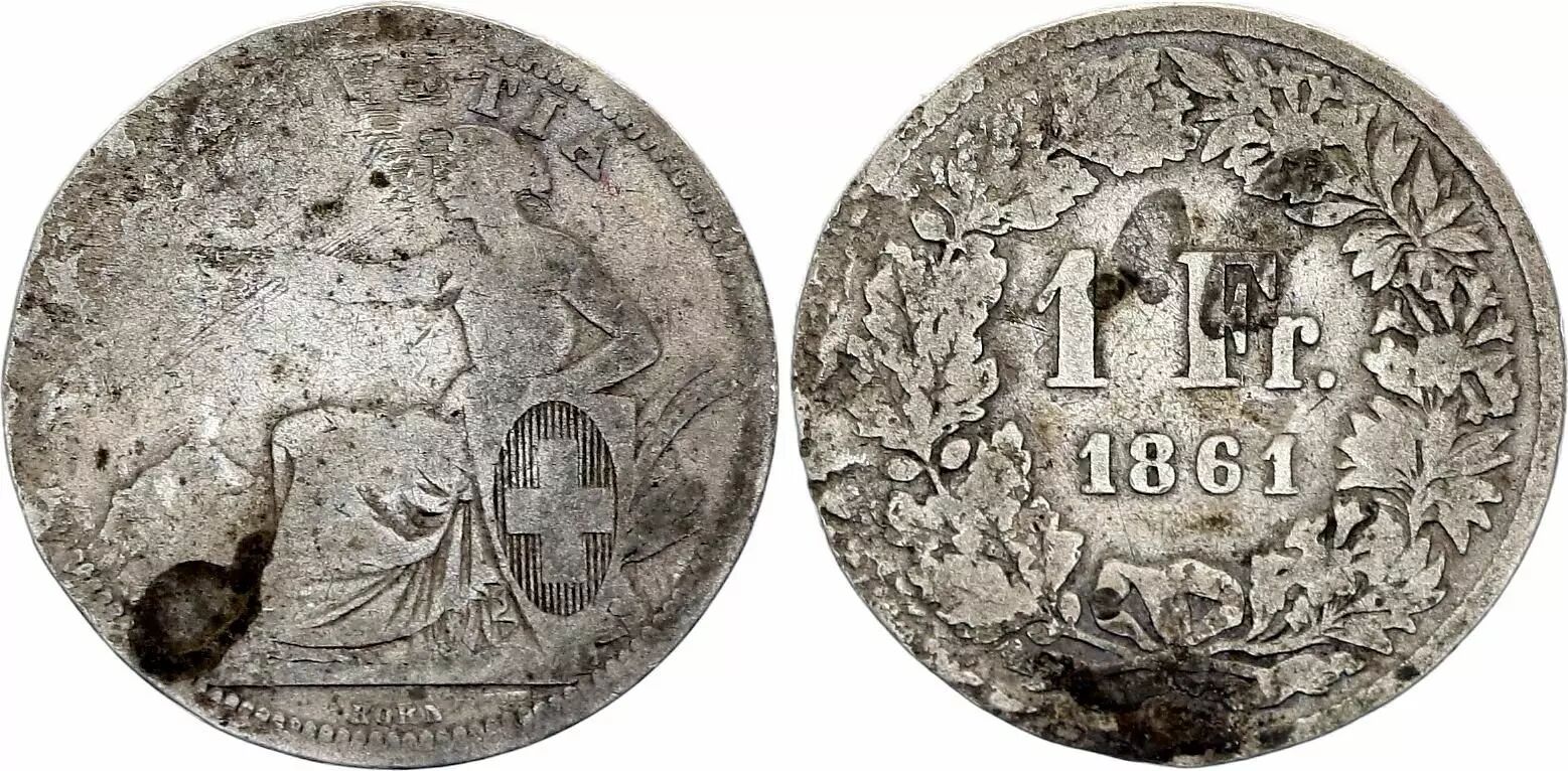 Pièce Suisse 1 Franc Helvetia assise - 1861 - B Bern - Argent
