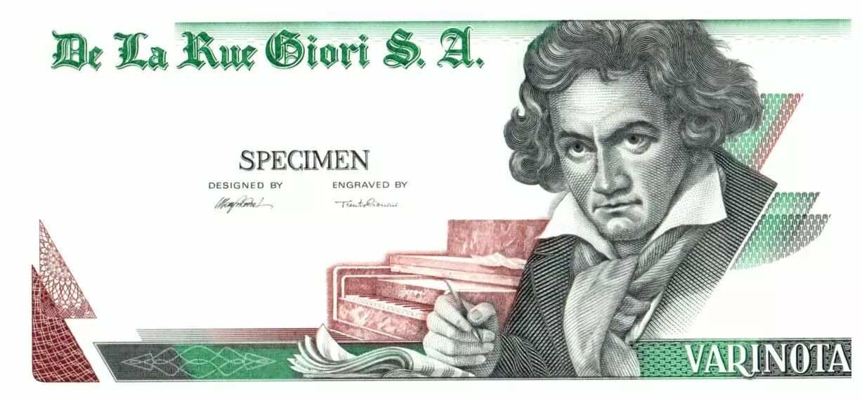 Billet Suisse 1 Varinota, Echantillon De la Rue Giori - Beethoven - Uniface Vert et Crème