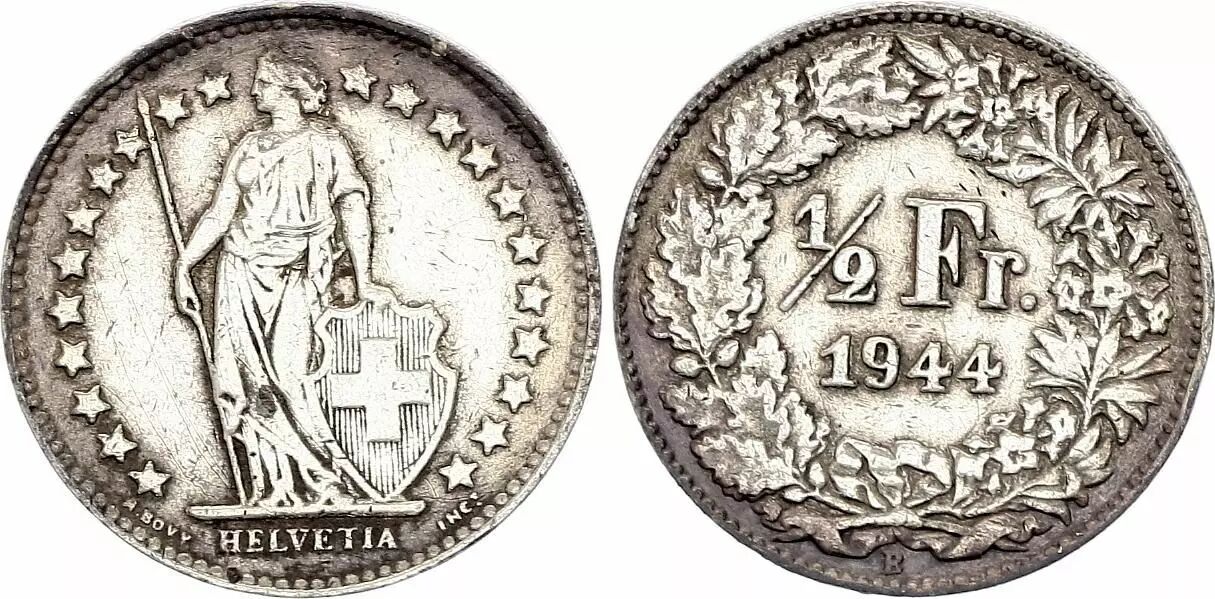 Pièce Suisse 1/2 Franc Helvetia - 1944 - B Bern - Argent