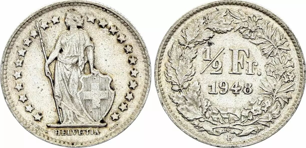 Accueil > Monnaies du monde > Pièces en Argent > Suisse 1/2 Franc Helvetia - 1948 - B Bern - Argent