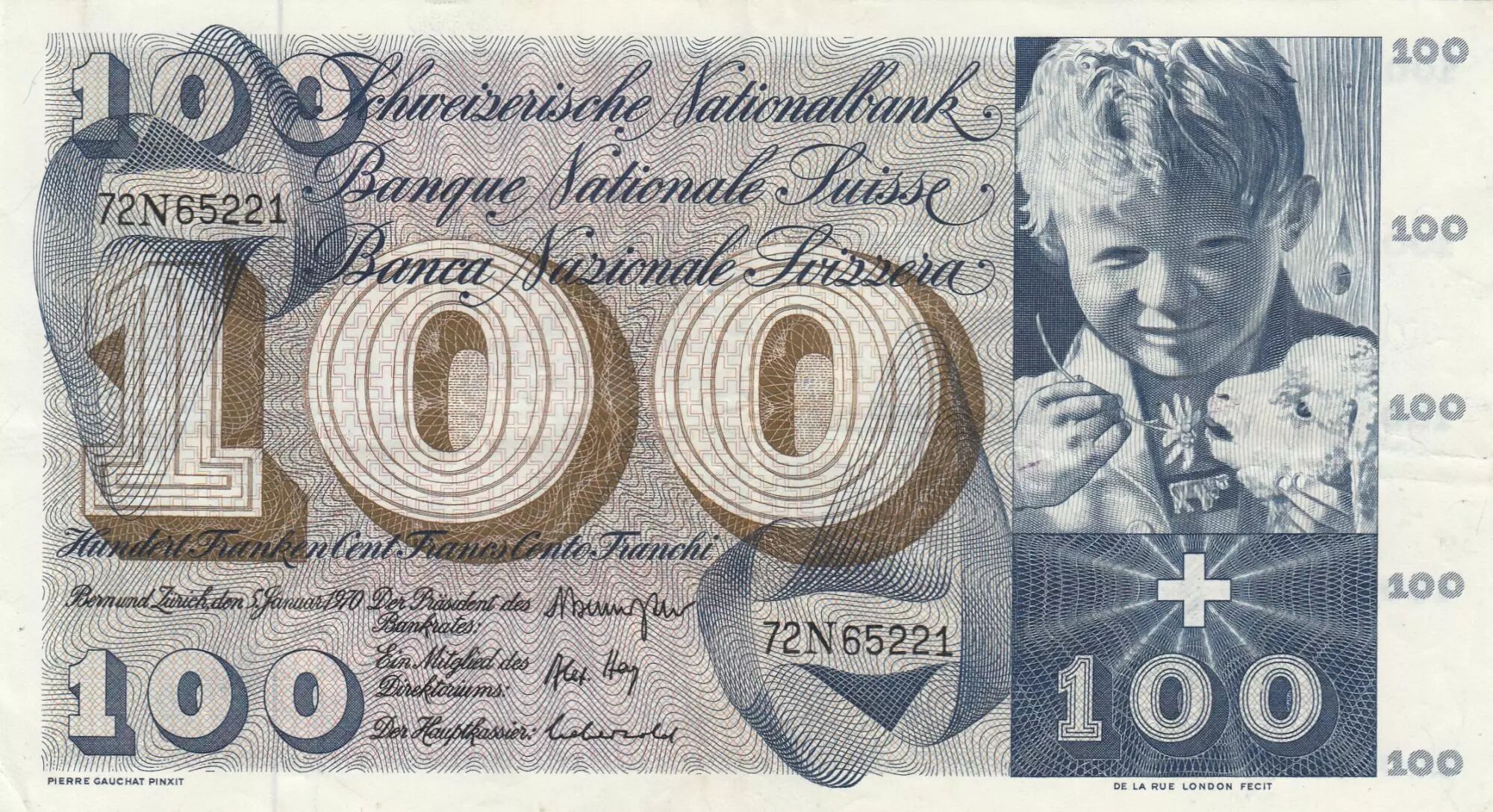 Accueil > Archivage > archivage-Billets du Monde > Suisse 100 Francs - Enfant St Martin - 05-01-1970 - Série 72N