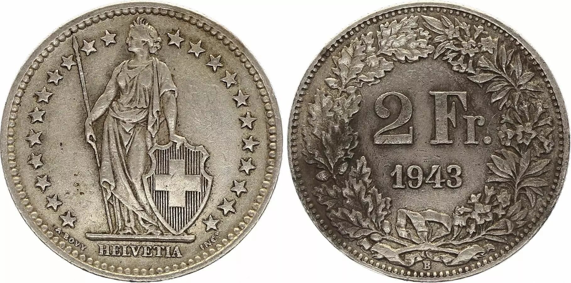 Pièce Suisse 2 Francs Helvetia - 1943 - B Bern - Argent