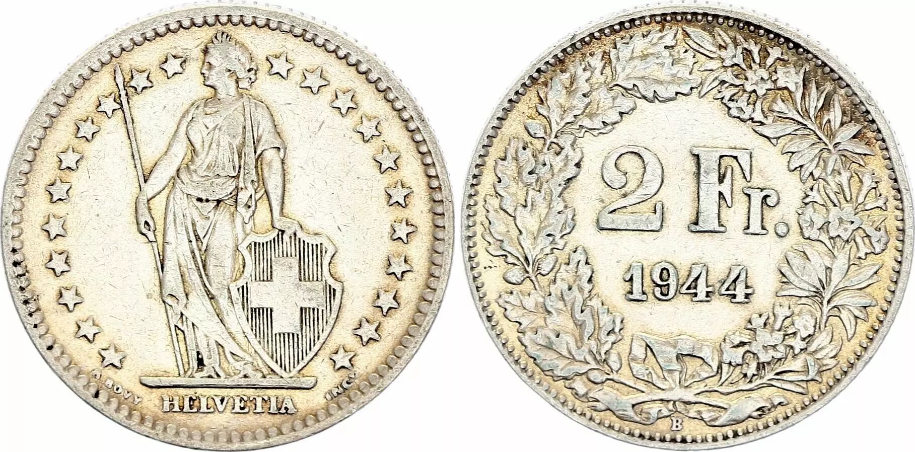 Accueil > Archivage > archivage-Monnaies du monde > Suisse 2 Francs - Helvetia - 1944 - B Berne - Argent