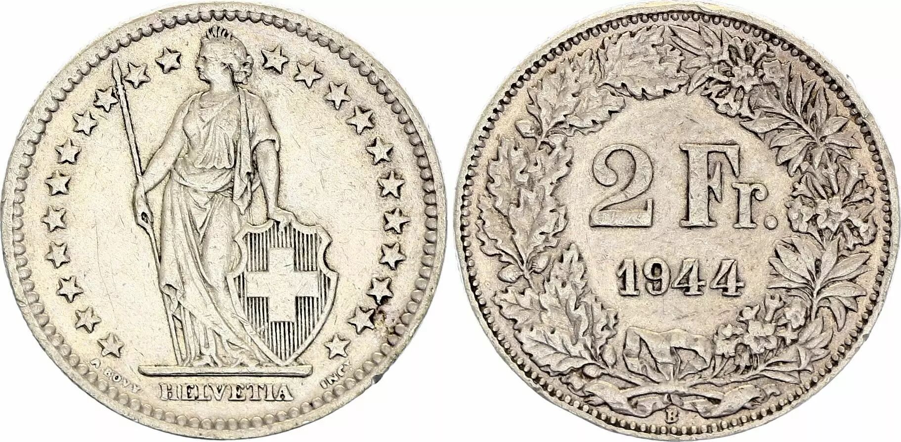 Accueil > Archivage > archivage-Monnaies du monde > Suisse 2 Francs - Helvetia - 1944 - B Berne - Argent